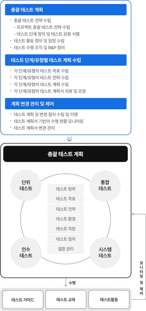 프로젝트의 일정과 특성에 따라 테스트 레벨과 유형을 다양하게 구성하여, 최적의 테스트 수행 환경을 구축합니다.
